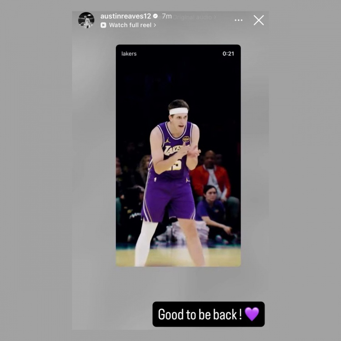 赛后,伤缺一个多月、本场迎来复出的里夫斯更新INS晒出今日赛场瞬间并写道:“回归的感觉很棒!”