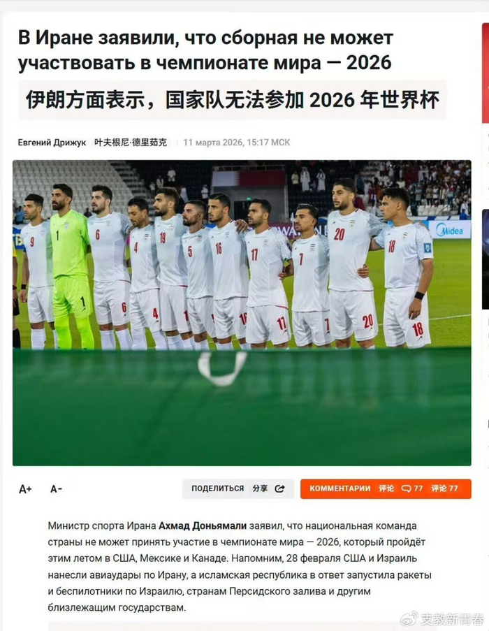 伊朗男足,通过社交媒体发布退出2026年美加墨世界杯的声明。