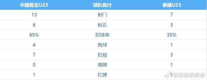 中国U23男足的控球率为65%,一共有13次射门,其中6次射正,泰国U23男足一共有7次射门,其中3次射正。