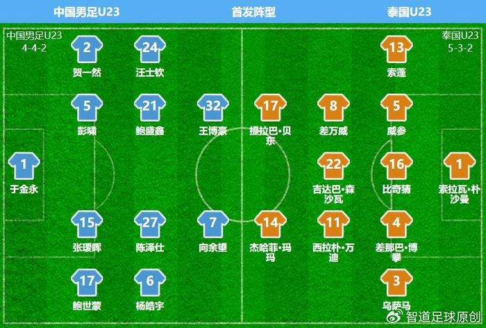 泰国U23首发:1-索拉瓦·朴沙曼、3-乌萨马·添坎、4-差那巴·博攀、5-威参·伊纳拉姆、8-差万威·社劳、11-西拉朴·万迪、13-索蓬·内翁、14-杰哈纳菲·马玛、16-比七猜·先甲托、17-提拉巴·贝东、22-吉达巴·森沙瓦